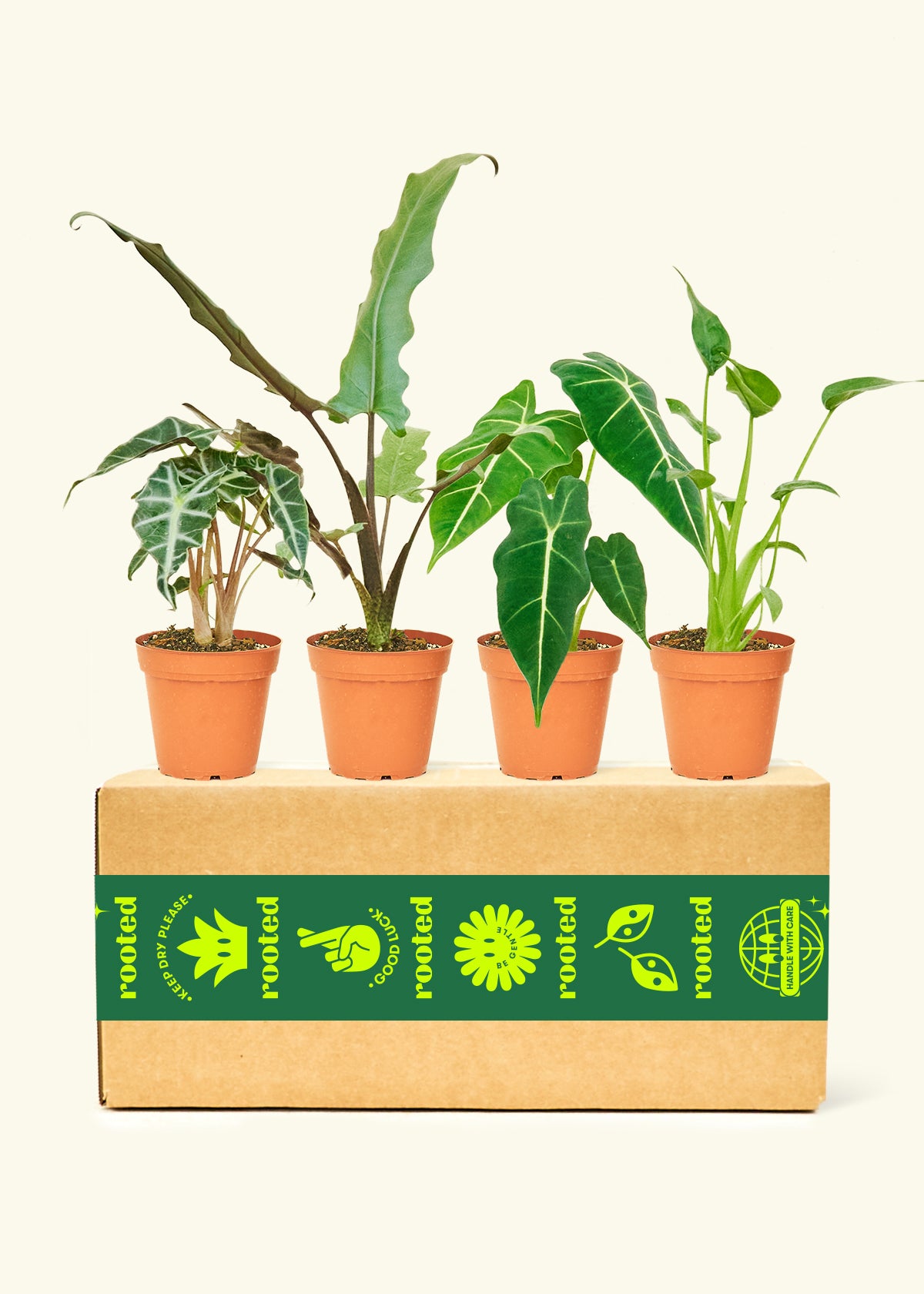 The perfect box for the avid plant lover in your life. Each box includes four small (4” pot) premium assorted alocasias, picked and prepped by our growers themselves.