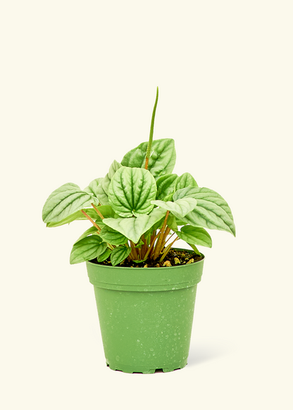 This peperomia features silver frosted leaves and pink stems. It's a slow grower and easy to care for. Flower spikes will appear with bright light, adding even more character to this beautiful plant.
