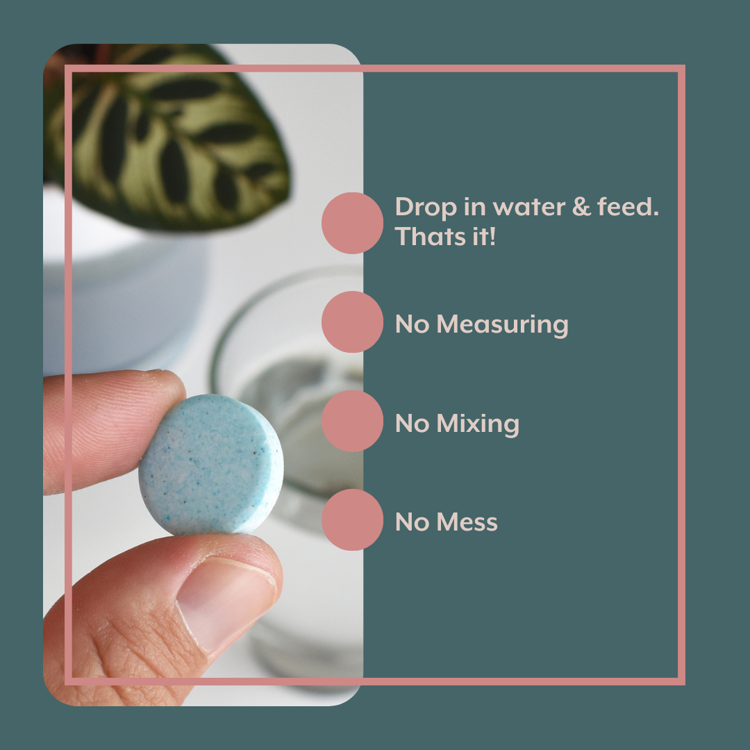 For feeding your collection of indoor plants. Our gentle 4-3-6 (N-P-K) Plant Food formula provides all the essential nutrients your indoor plants need along with trace micronutrients for a well-rounded plant diet. Our ProBioticscultivate healthy, living soils with a specially crafted blend of 19 beneficial microbes including mycorrhizal fungi. This combination of Plant Food and ProBiotics promotes lush, healthy houseplant growth. The bubbling action of our tablets make them an easy, fun and climate-friendly way to feed your plants. EASY TO USE! No measuring, no mixing, no mess! Just drop in water and feed. Includes watering can.